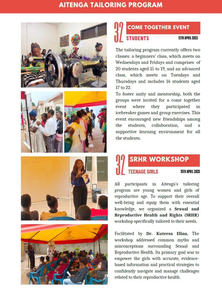 Ebenso beeindruckend ist auch eine unserer Mitteilungen aus Afrika von der „Aitenga Women Empowerment Organisation“ in Uganda, die wir mit Nähkursen für junge Frauen gefördert haben (siehe auch Ausschnitt aus deren Newsletter auf unserem Foto-Beiblatts):
